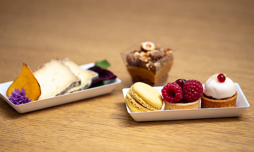 1 coupelle de dessert : 2 réductions sucrées, 1 mini verrine sucrée, 1 macaron selon l’inspiration du chef