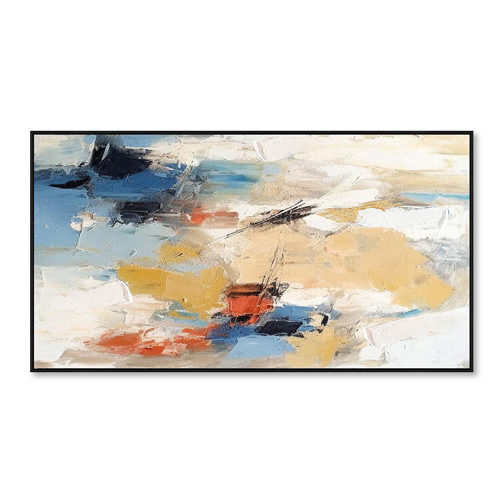 Peinture Originale Abstraite Jaune et Bleu – Référence 03.3453 : Dimension visible de la toile : 70×140 cm & Dimension extérieure du cadre : 72×142 cm & l’épaisseur sur le mur est 5.5 cm.