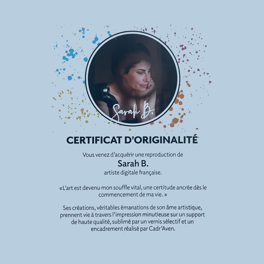 Née en 1983 à Périgueux, en Dordogne, Sarah B. a développé sa passion pour l’art du dessin dès son plus jeune âge. L’art est devenu son souffle vital, une certitude ancrée dès le commencement de sa vie.