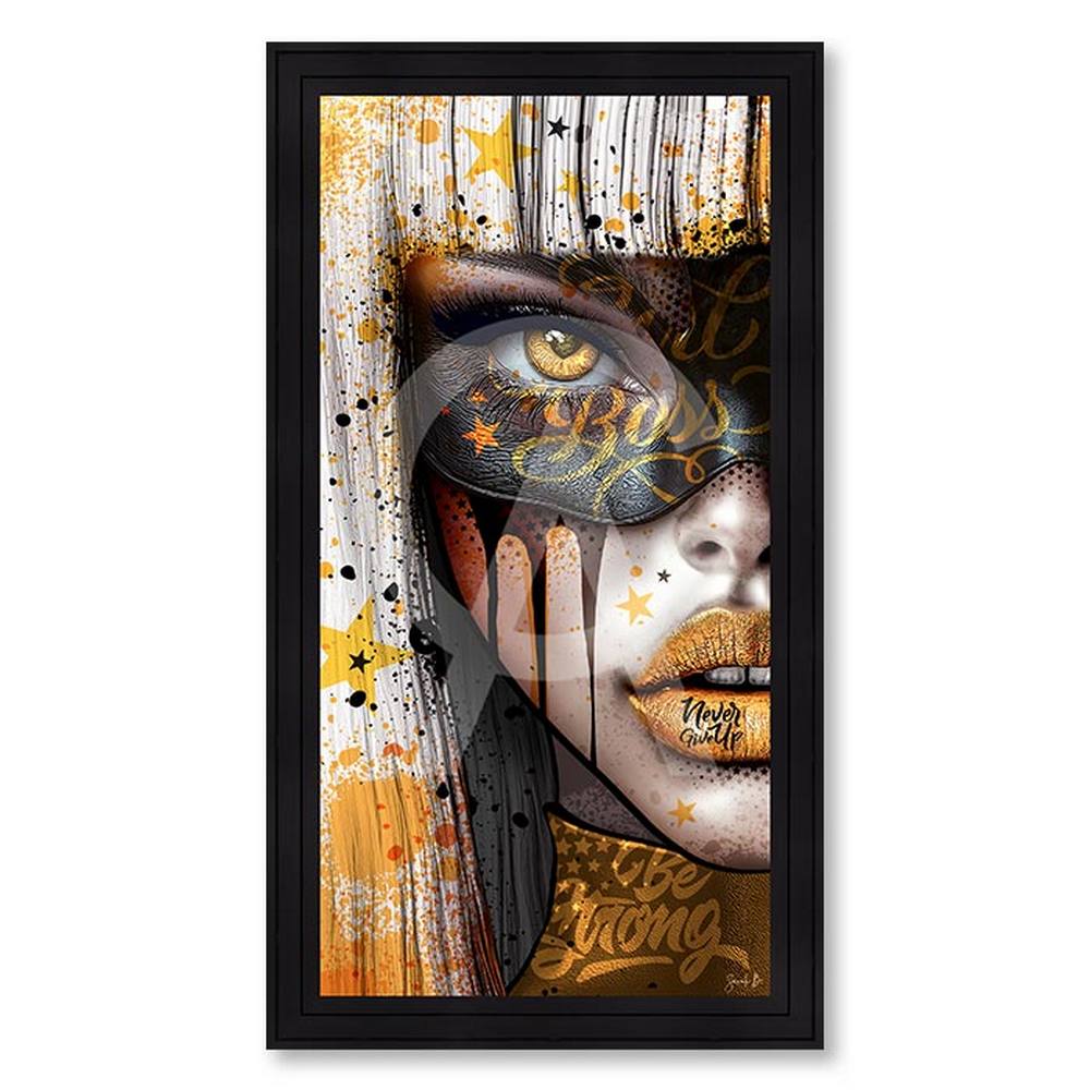 Cette décoration murale est une reproduction encadrée sans verre de l’artiste Sarah B. Elle représente une femme cheveux blonds, masque noir autour des yeux et rouge à lèvres jaune sur les lèvres.