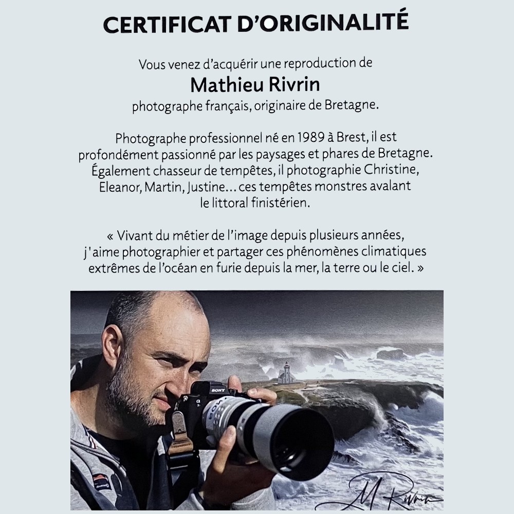 Mathieu Rivrin est un photographe français, originaire de Bretagne. Photographe professionnel né en 1989 à Brest, il est profondément passionné par les paysages et les phares. Il photographie en général la Bretagne mais aussi le Mont Saint-Michel, l’Islande et l’Écosse. Également chasseur de tempêtes, il a photographié Christine, Eleanor, Martin, Justine…ces tempêtes monstres avalant le littoral finistérien.