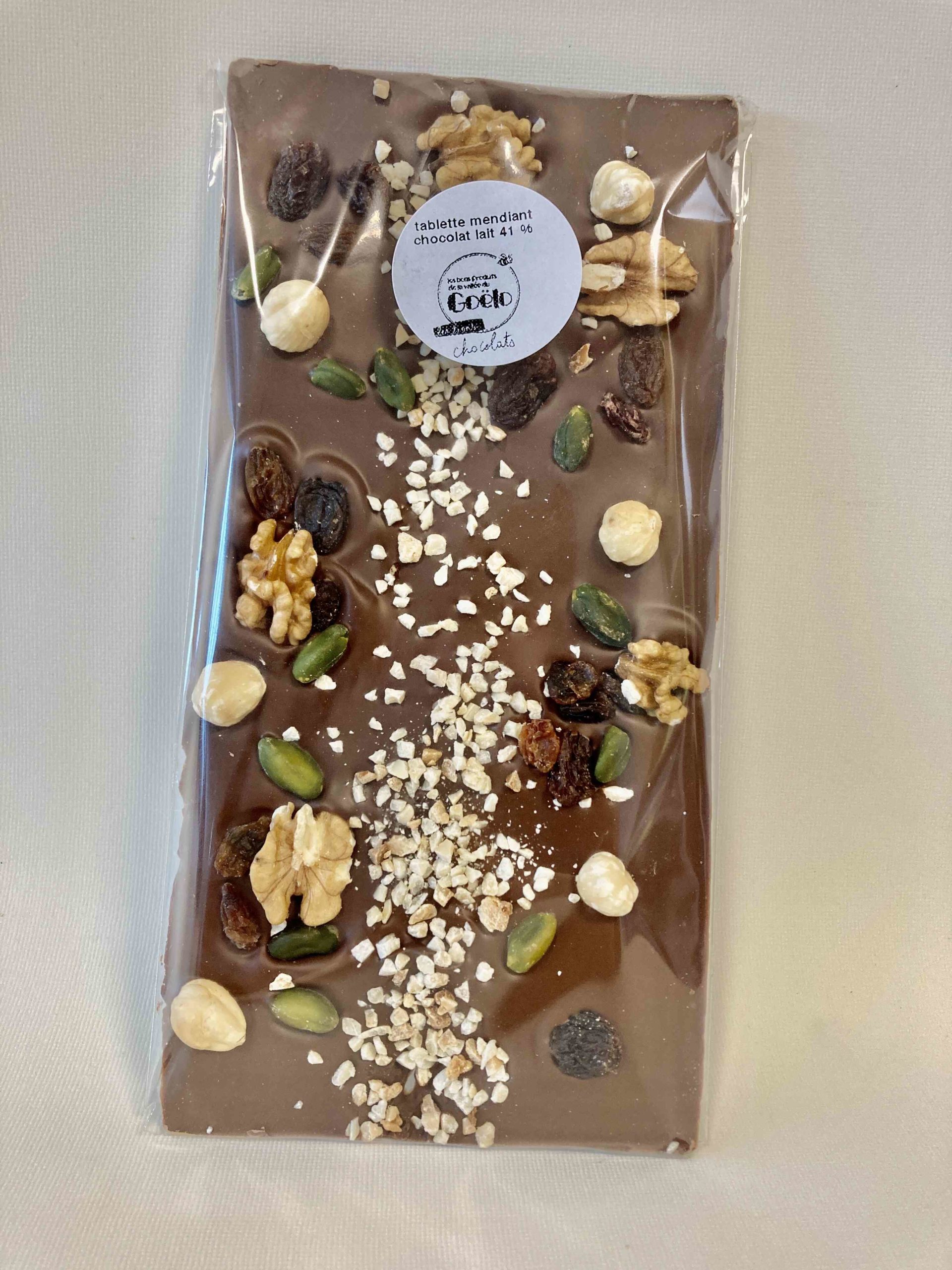 Tablette mendiant au chocolat au lait 35% de cacao.