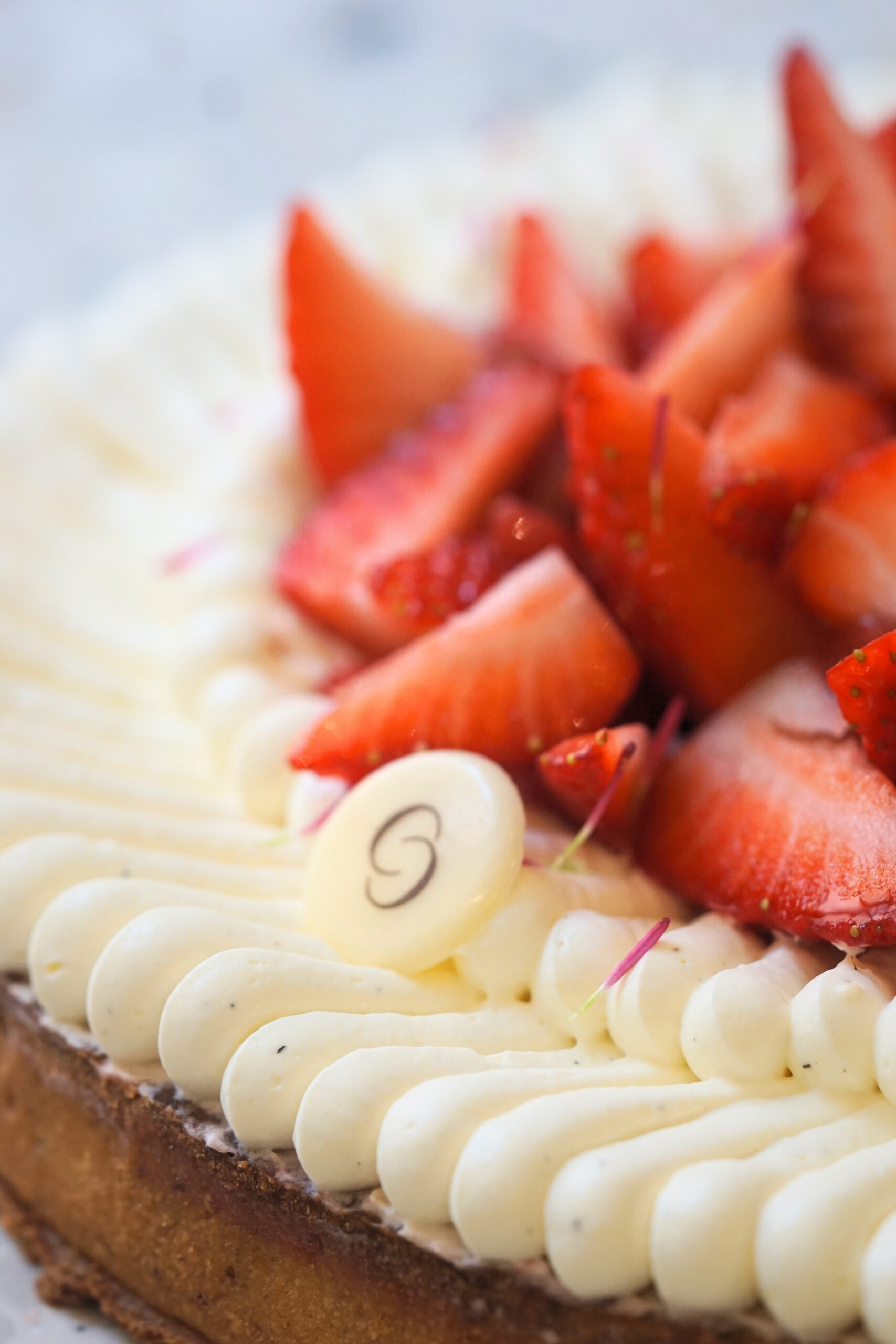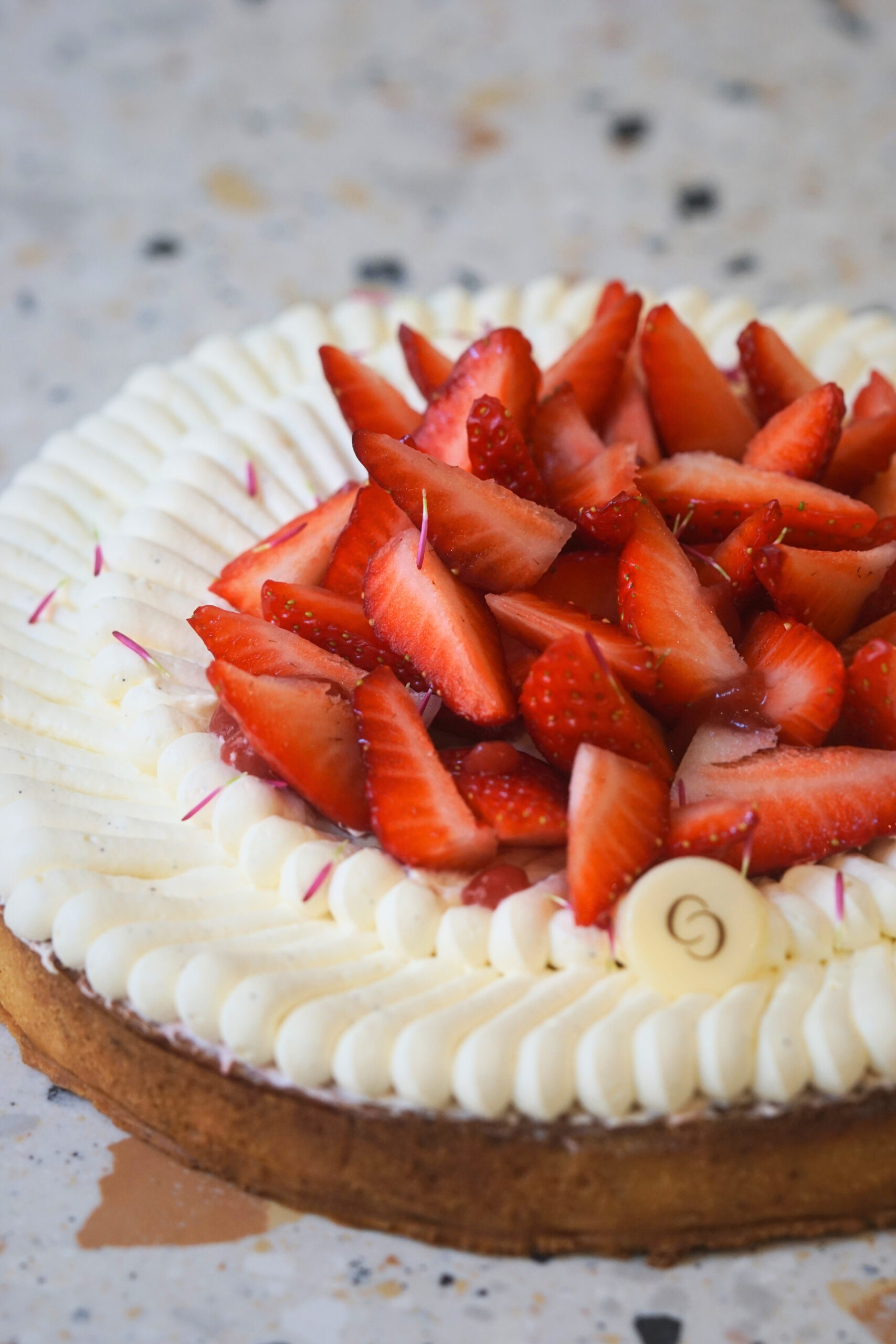Cette tarte est une création alliant fraicheur et gourmandise. Elle est composée d’une pâte sucrée croustillante aux amandes, d’une crème d’amande, et d’un confit de fraise. Sur le dessus, un suprême vanille, aérien et onctueux, accompagne les fraises fraiches. De quoi se régaler!